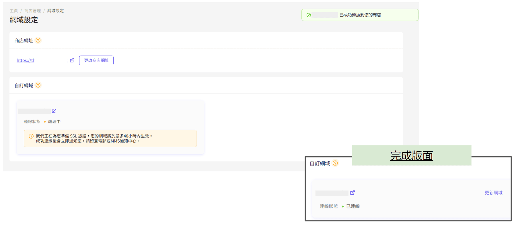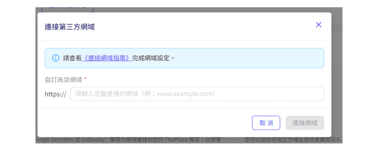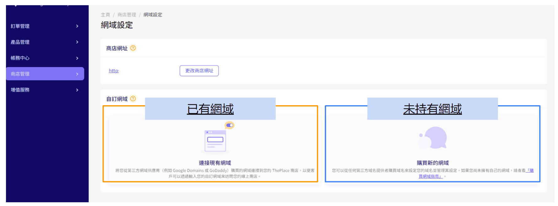 商戶亦可進一步使用與品牌或商店相關的字詞自訂網店的獨有網址(例如:www.example.com),自訂網域設置如下