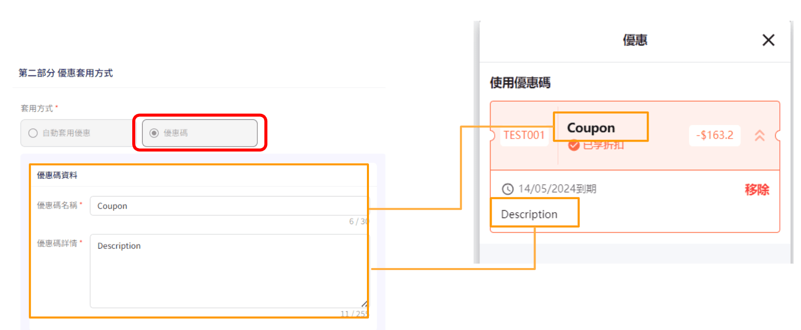 加入產品:當客人所選產品達到優惠活動的購買門檻時(例如最低訂單金額或數量),該優惠碼將適用。