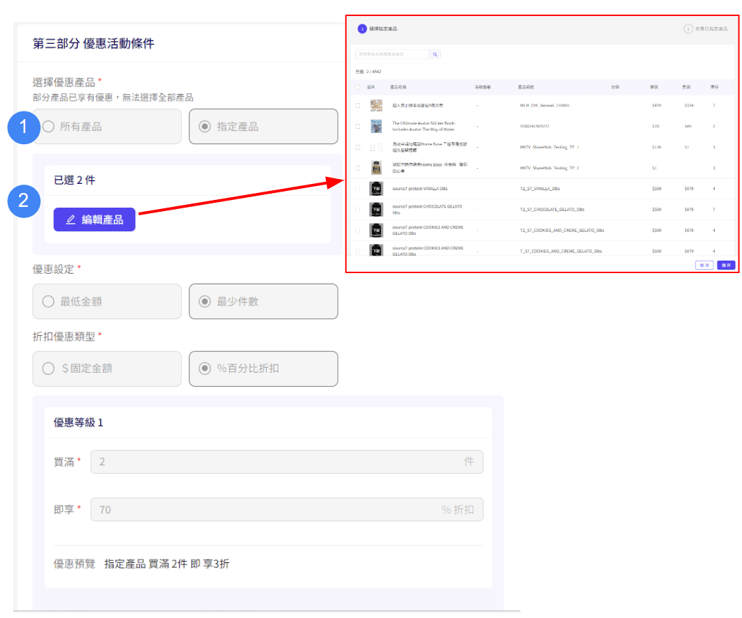 * 備註:一個交易同時只能使用一個優惠碼,但優惠活動(如滿額即減/享有折扣)可與優惠碼同時使用。購買門檻可以在特定產品上設定為「最低金額」或「最低數量」。一旦設定了條件,您可以設定該優惠活動的具體折扣百分比、金額或產品數量。每個優惠活動最多可設定三個不同層級的折扣,以幫助提升銷售。