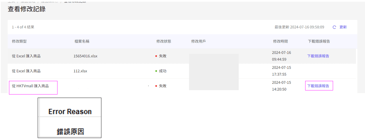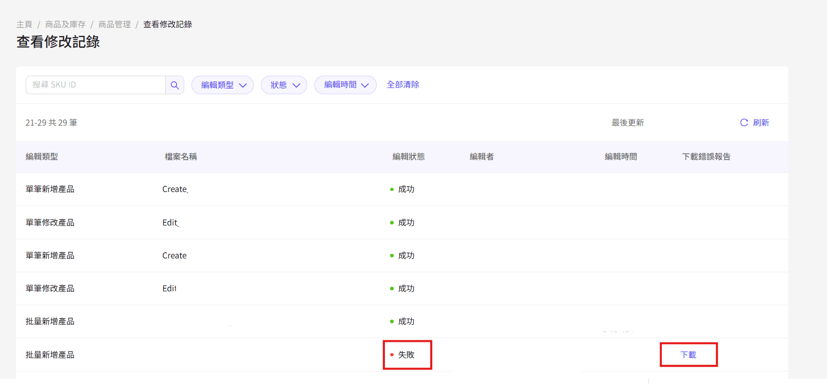如果批量新增無法成功創建,您可以從「查看修改記錄」頁面中下載錯誤報告。